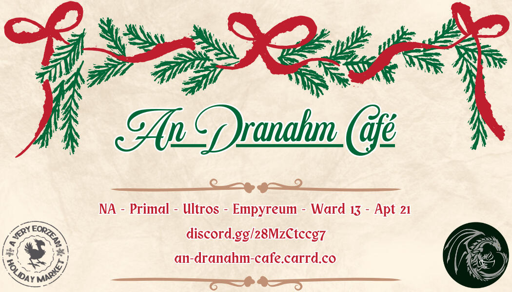 "An Dranahm" is a Dravanian term that translates to "Our Dragonsong" in the common tongue, and the café seeks to honor this new age and the renewed peace between the peoples of Ishgard, the dragons of Dravania, and the beast tribes of Coerthas, Dravania, and Abalathia through a celebration of regional cuisine.From dishes served in the houses of Ishgard to common fare served by the soldiers in the Highlands and the trappers of Dravania, there's a little taste of all the local lands, and a comfortable atmosphere to sit down and enjoy your meal in.Not quite in the mood for a sit down? That's fine, since we can make that order to go as well.Interested in adding to the melody of our song instead of enjoying a fresh cup of tea? Talk to one of the staff about performing - the stage is open to one and all.